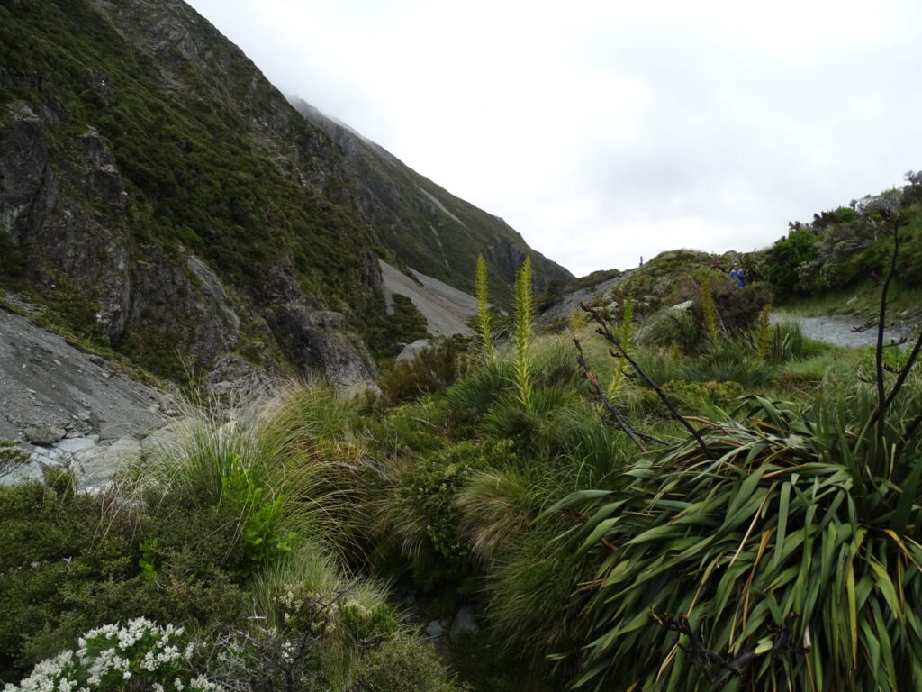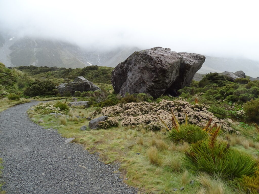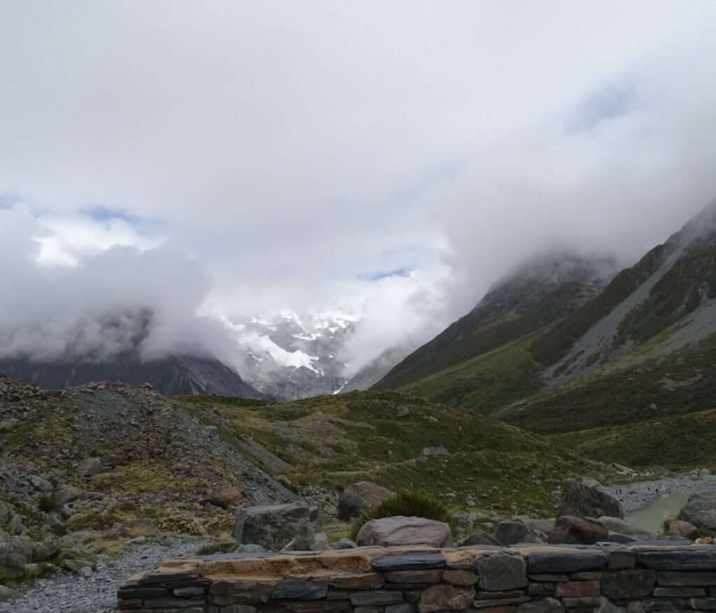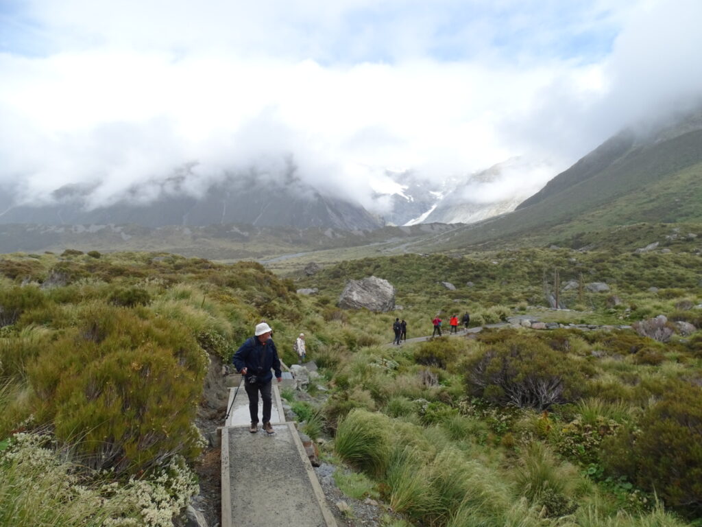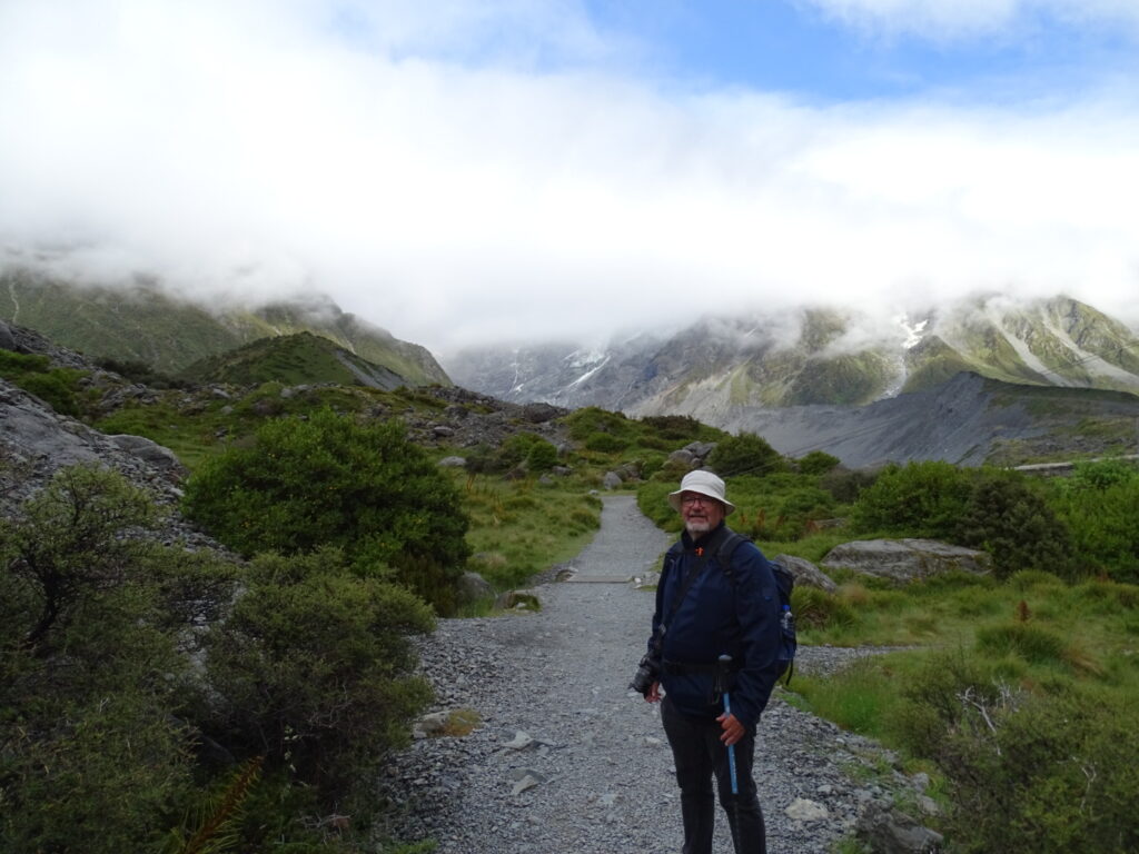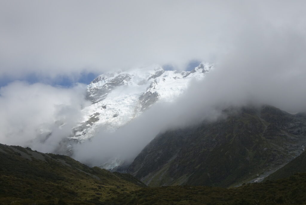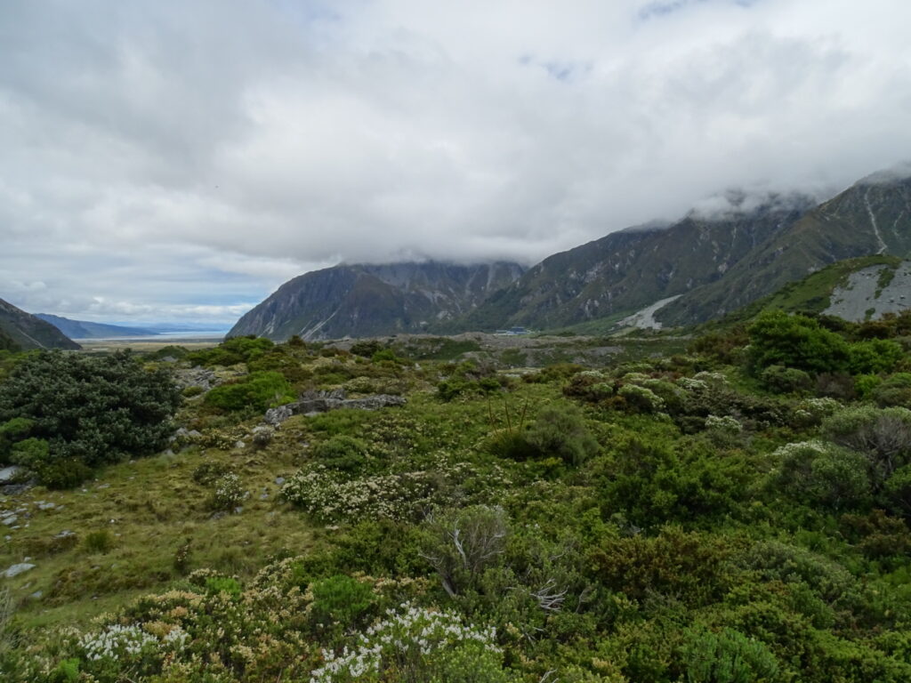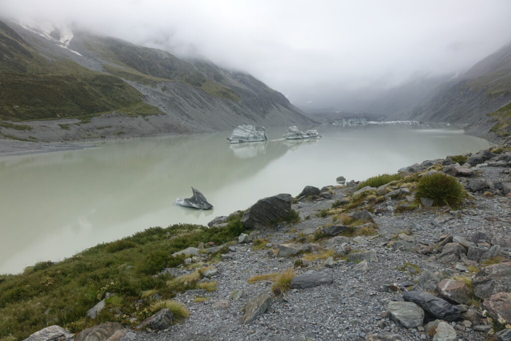 Mount Cook hebben we tijdens de wandeling niet meer gezien, laag hangende bewolking wat het deed lijken of het miezerde, de hoge bergen die het zicht blokkeerden, maar dit alles was zeer zeker de moeite waard en aan het einde van de track heb je dit uitzicht.