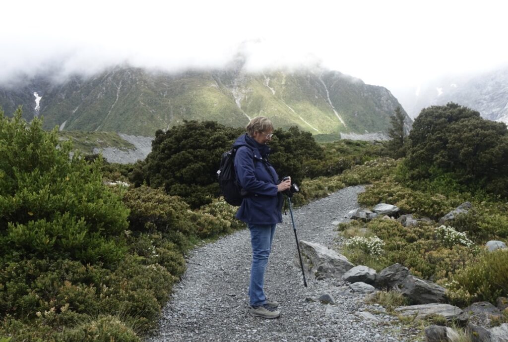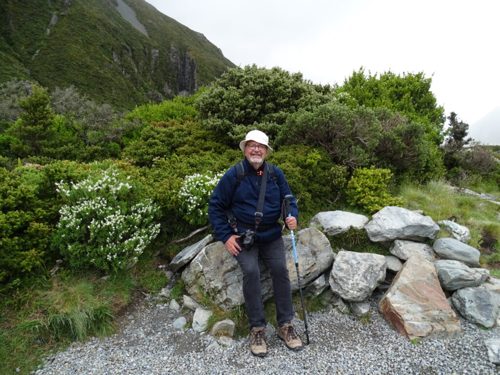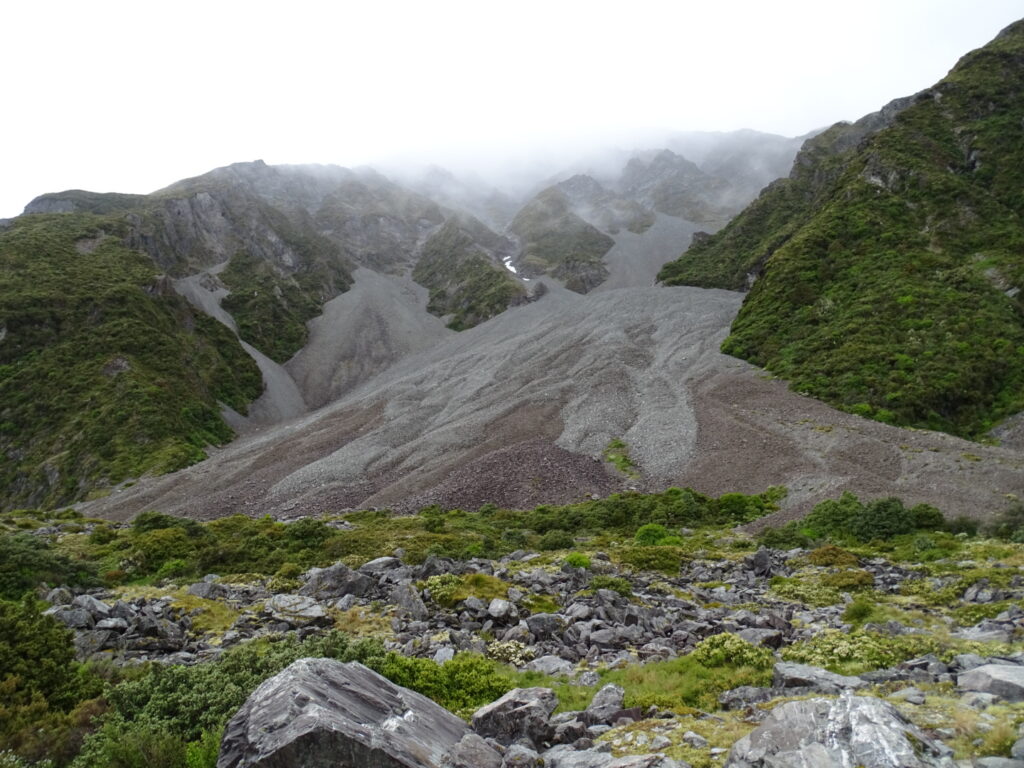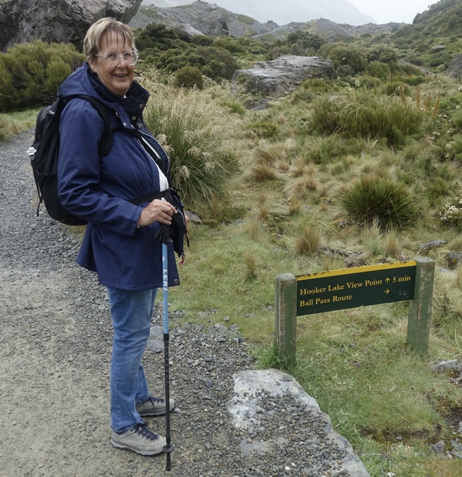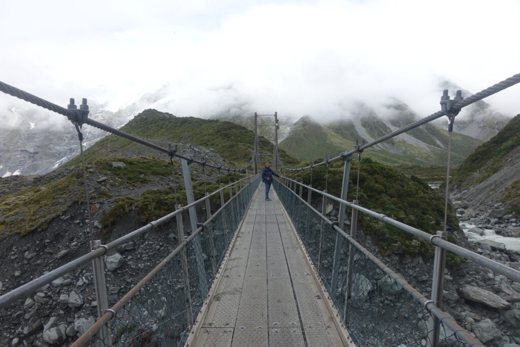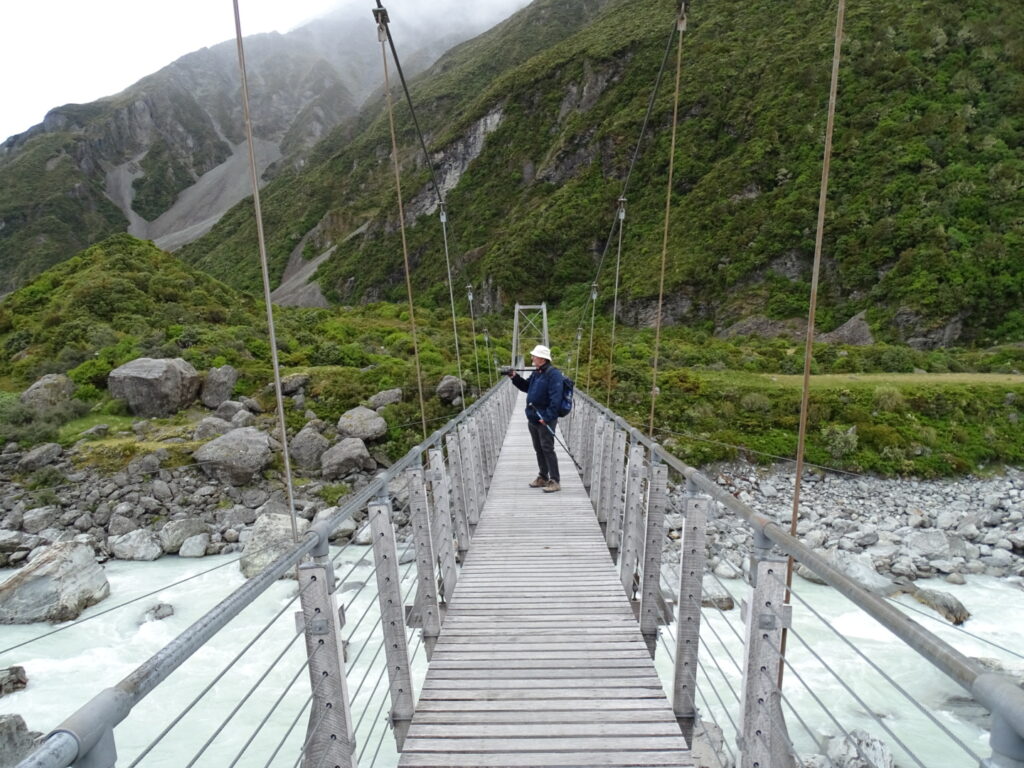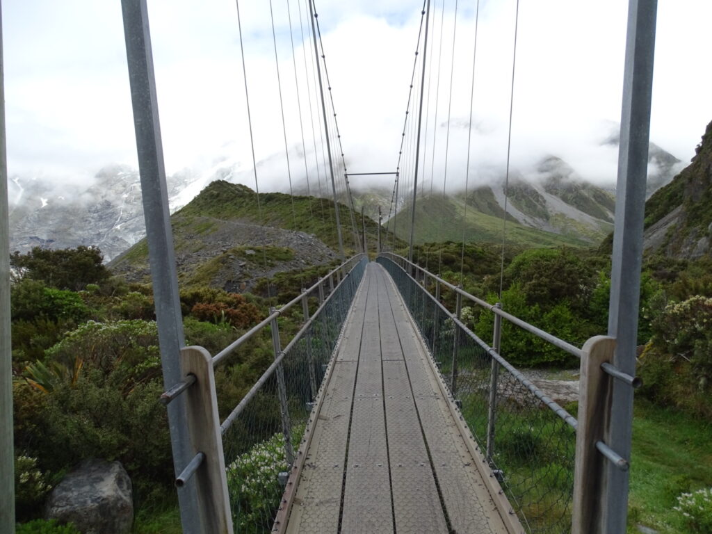 Mount Cook hebben we tijdens de wandeling niet meer gezien, laag hangende bewolking wat het deed lijken of het miezerde, de hoge bergen die het zicht blokkeerden, maar dit alles was zeer zeker de moeite waard en aan het einde van de track heb je dit uitzicht.