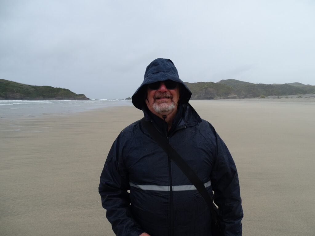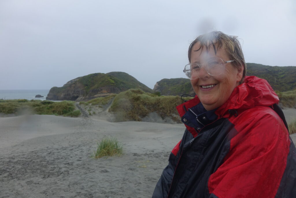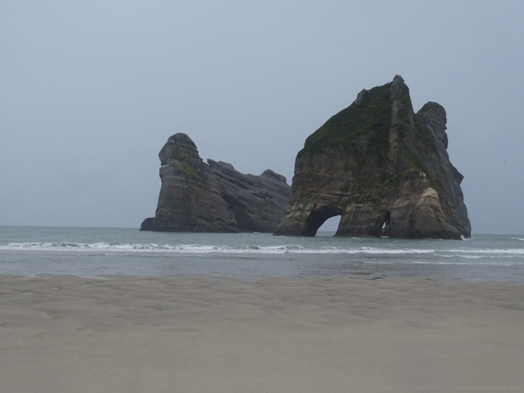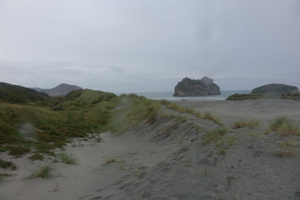 Gelukkig staan er deze reis nog heel veel andere mooie dingen op het programma. Zo ook vandaag weer. We zijn van Takaka naar Wharariki beach gereden, niet ver van Cape Farewell. Een iconisch strand dat ook gebruikt is als een van de Microsoft Windos 10 achtergrond foto’s. Helaas voor ons was het weer wat minder mooi. Op de wandeling er naar toe kwamen we nog een moeder Pauw met kroost tegen. Het strand stil en verlaten was ondanks het slechte weer nog steeds heel mooi.