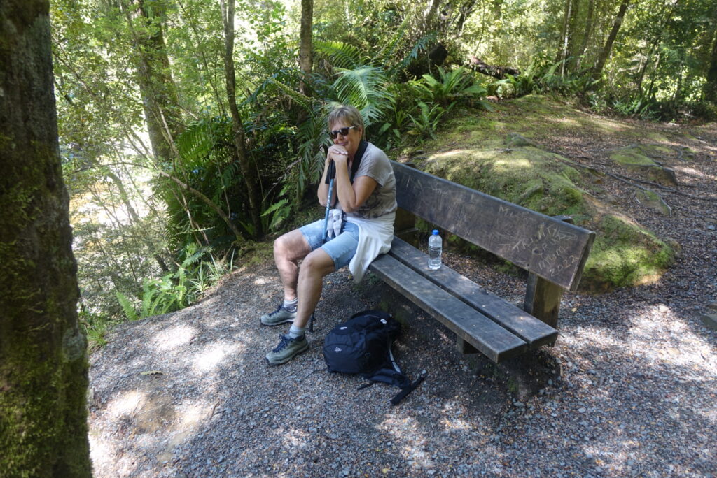 We vertrokken om 8.15 waren bij het einde van de track om 10.15, vertrokken weer om 10.30 en waren bij de auto 12.15. We vinden dit zeer knap gedaan voor twee ouderen, die wonen in een zeer vlak land, met niets of weinig conditie. Dit werd door mij vaak als excuus gebruikt als we met mensen aan de praat raakte, zoals het stel dat we tegen kwamen op hun retour, wij moesten nog verder, die zeiden dat het eindpunt was “ just behind this corner”. Een nog lange bocht links en naar rechts en dan nog een steile helling omhoog. Pffffff. We waren echt toe aan die bank met grote picknick tafel 😄