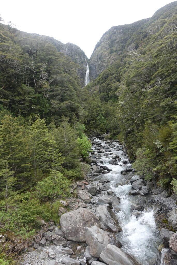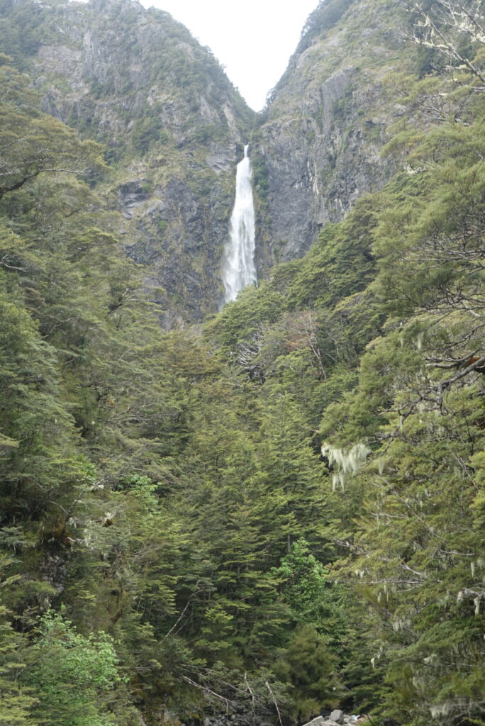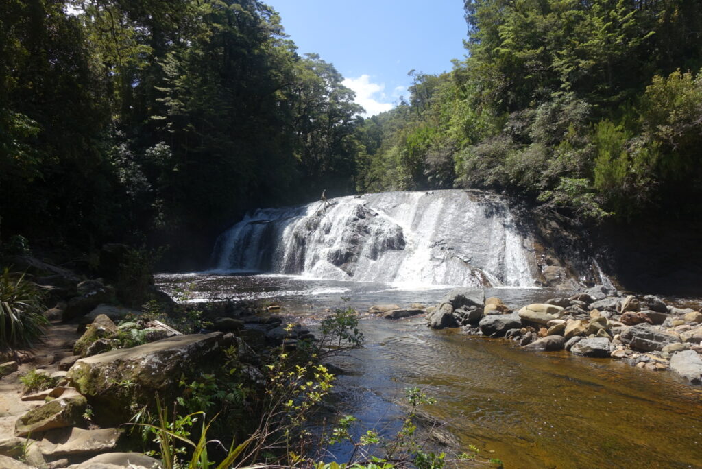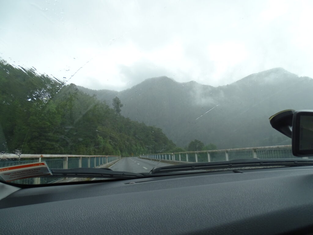 Na een eenvoudig ontbijt op weg naar Arthurs Pass, de Devil’s Punchbowl. De eerste stop van de dag. Bij de accommodatie scheen de zon en was het heerlijk. Maar naar mate we dichter bij Arthurs Pass kwamen werd de bewolking dikker.