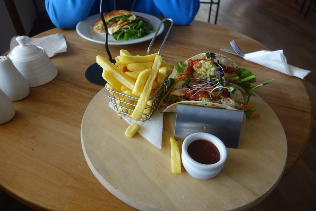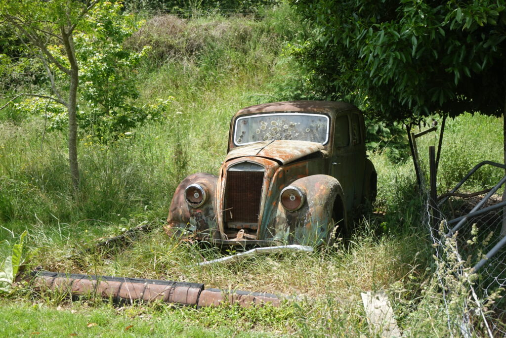 Dan komen we alweer op een bekende weg, de d-tour weg van Picton naar Kaiteriteri. Maar nu een tegenovergestelde richting. En de tijd tikt door 😏 bijna 12 uur, trek in koffie/thee dus stoppen bij een restaurant, dan gelijk maar geluncht we waren er nu toch. Dus de gekochte lunch van Takaka word nu ons avondeten, en dat is niet de eerste keer. Was weer erg lekker. Waar ook nog twee zeer oude auto geparkeerd stonden.