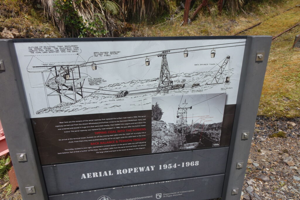 Volgende stop, we hebben het druk vandaag. De rit naar Denniston staat nog op het programma. De oude historische koolmijn ligt hoog op de berg en de lucht is blauw. Een lange slingerweg steeds hoger de berg op, geeft hele mooie ver gezichten. Mooie locatie om te bekijken en zeer interessant. Ongeveer en uurtje daar de Brakehead Walk gelopen.