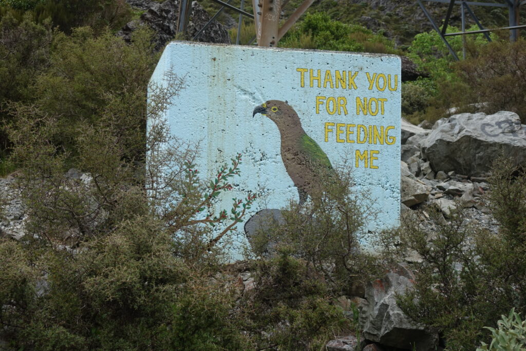 De reis gaat verder maar eerst een bakkie met een pie, was tenslotte al half twaalf, bijna lunch tijd. Bij het cafe staat groot te lezen de Kea niet te voeren, we hebben ze wel gezien. Leuke vogels.