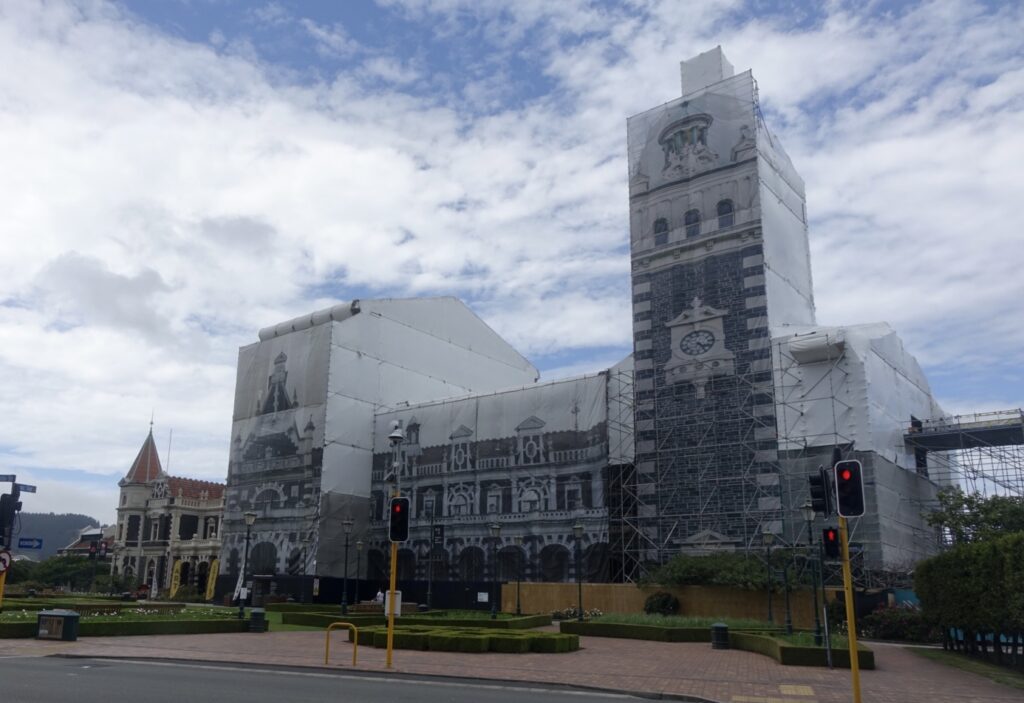 Terug naar Dunedin, eigenlijk wilden we daar in de middag een trein ritje doen met Taieri Gorge Railway. Helaas rijd deze minder frequent dan we gedacht hadden. En ook het mooie station van Dunedin was ingepakt voor een opknapbeurt.