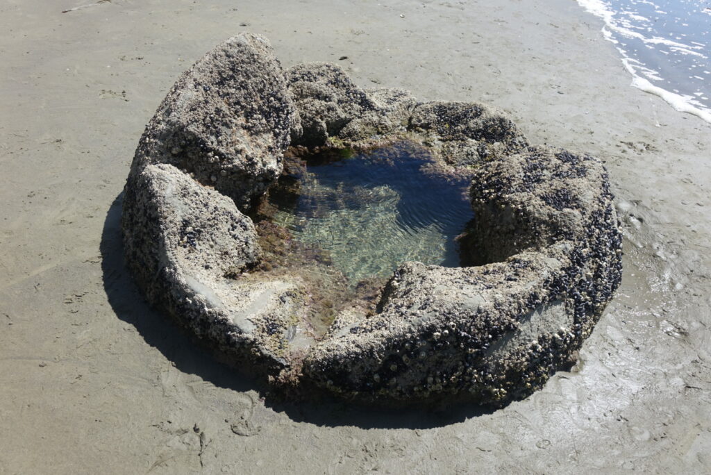 Echter van de balvorm was weinig te zien, alleen de topjes waren zichtbaar. De rest was onder het strandzand verborgen.