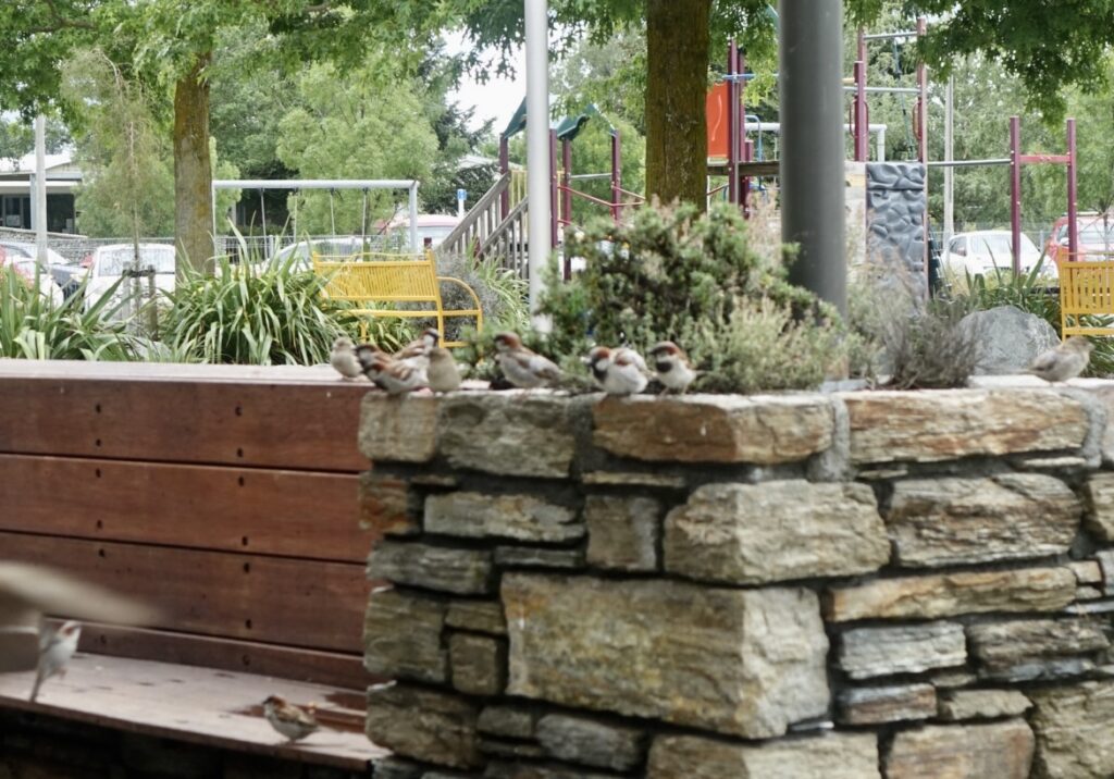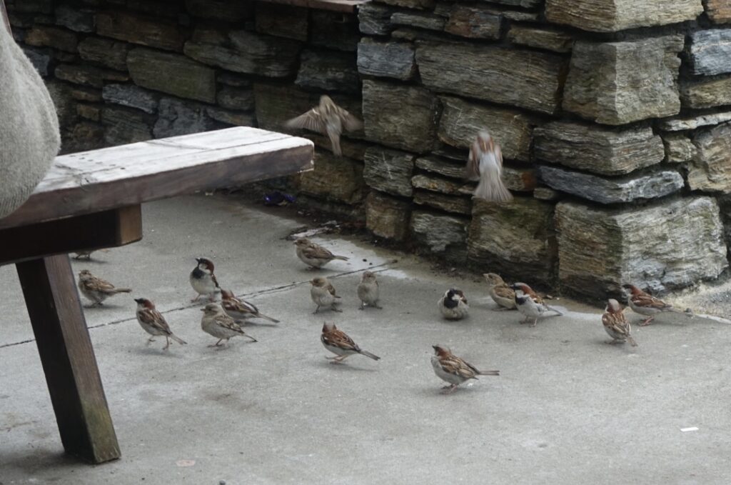 Daarna weer terug naar Twizel voor een kopje koffie en thee en wat lekkers. Dat lekkers was, wat de plaatselijke mussen al wisten, heel erg lekker. Ze zaten met zijn allen te wachten tot er iets te snoepen was en dan was het weg voor je er erg in had.